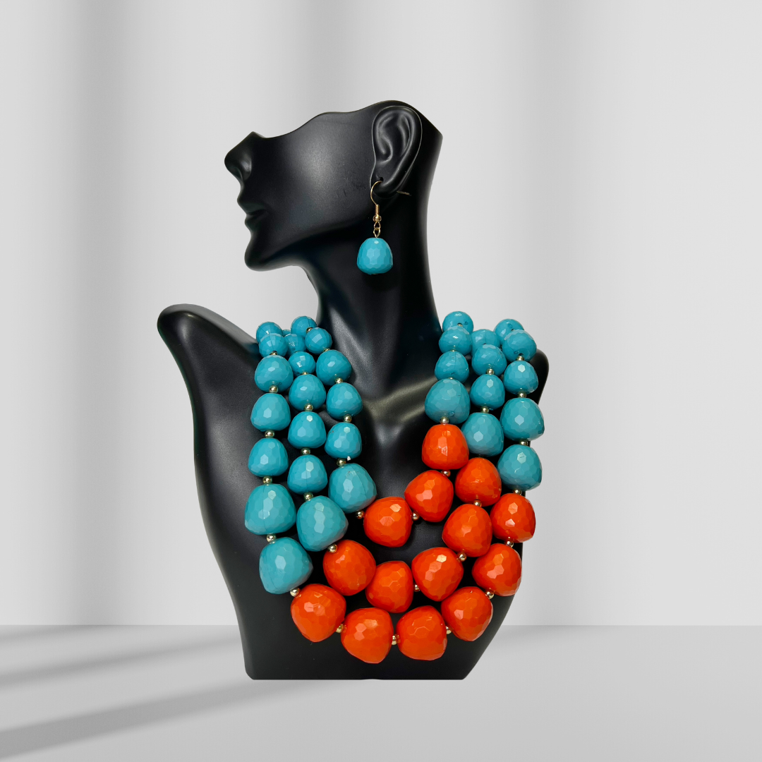 Blue & Orange Beaded Layered Necklace & Drop Earrings