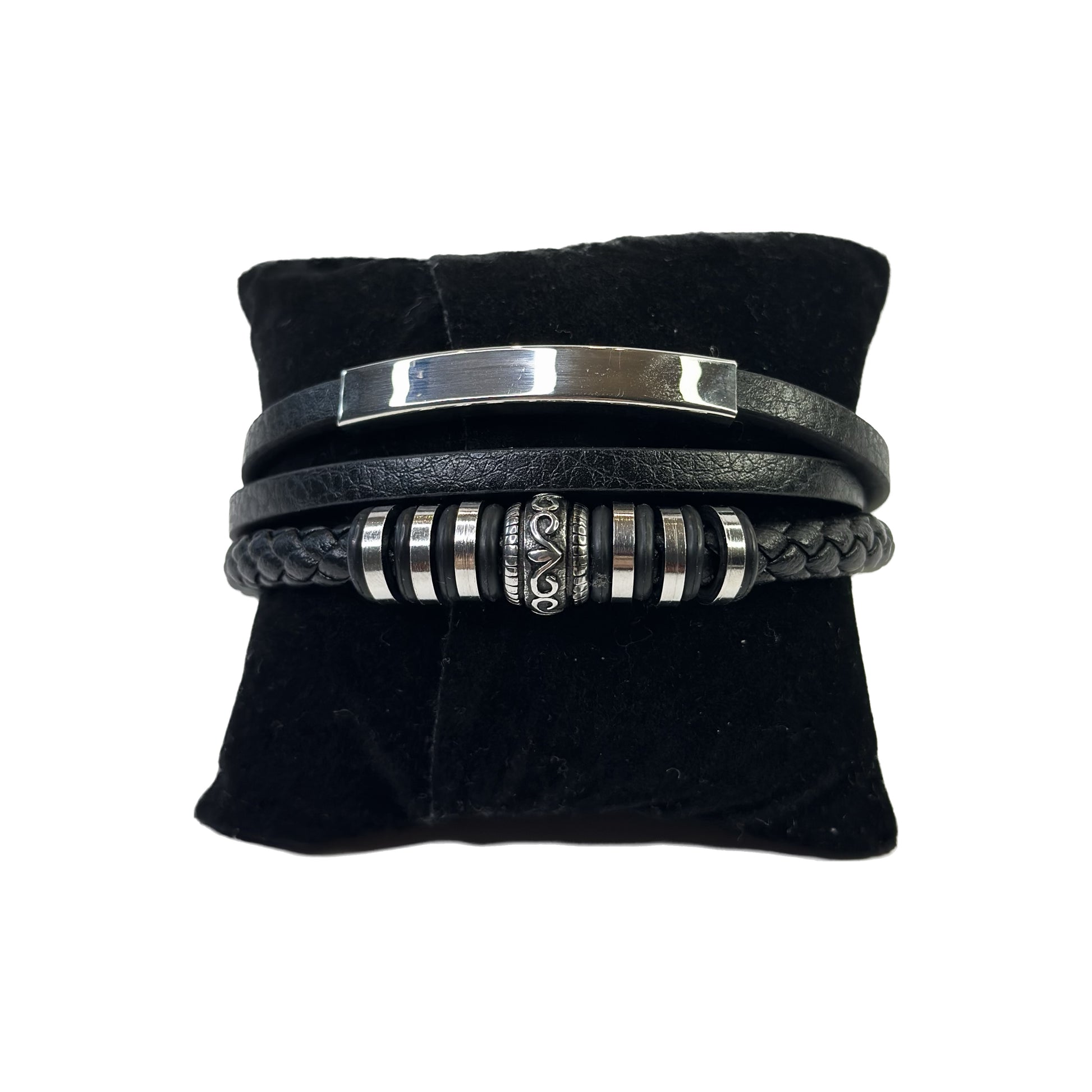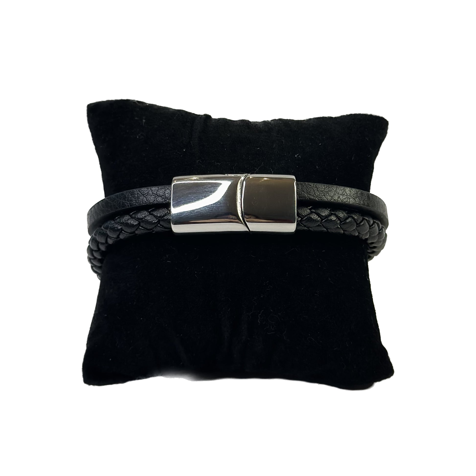 Sleek gentlemen leather bracelet with magnetic strap made of stainless steel.